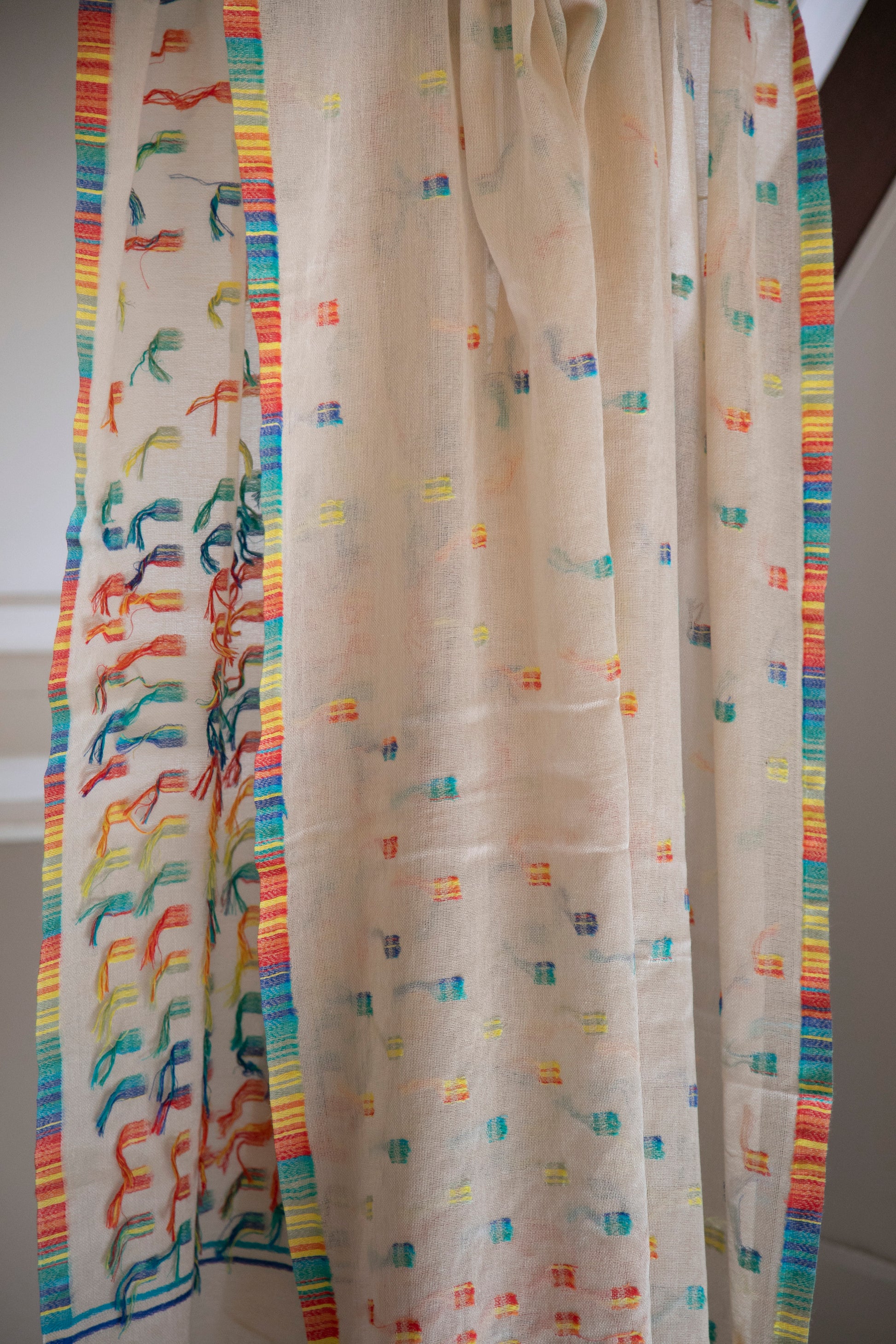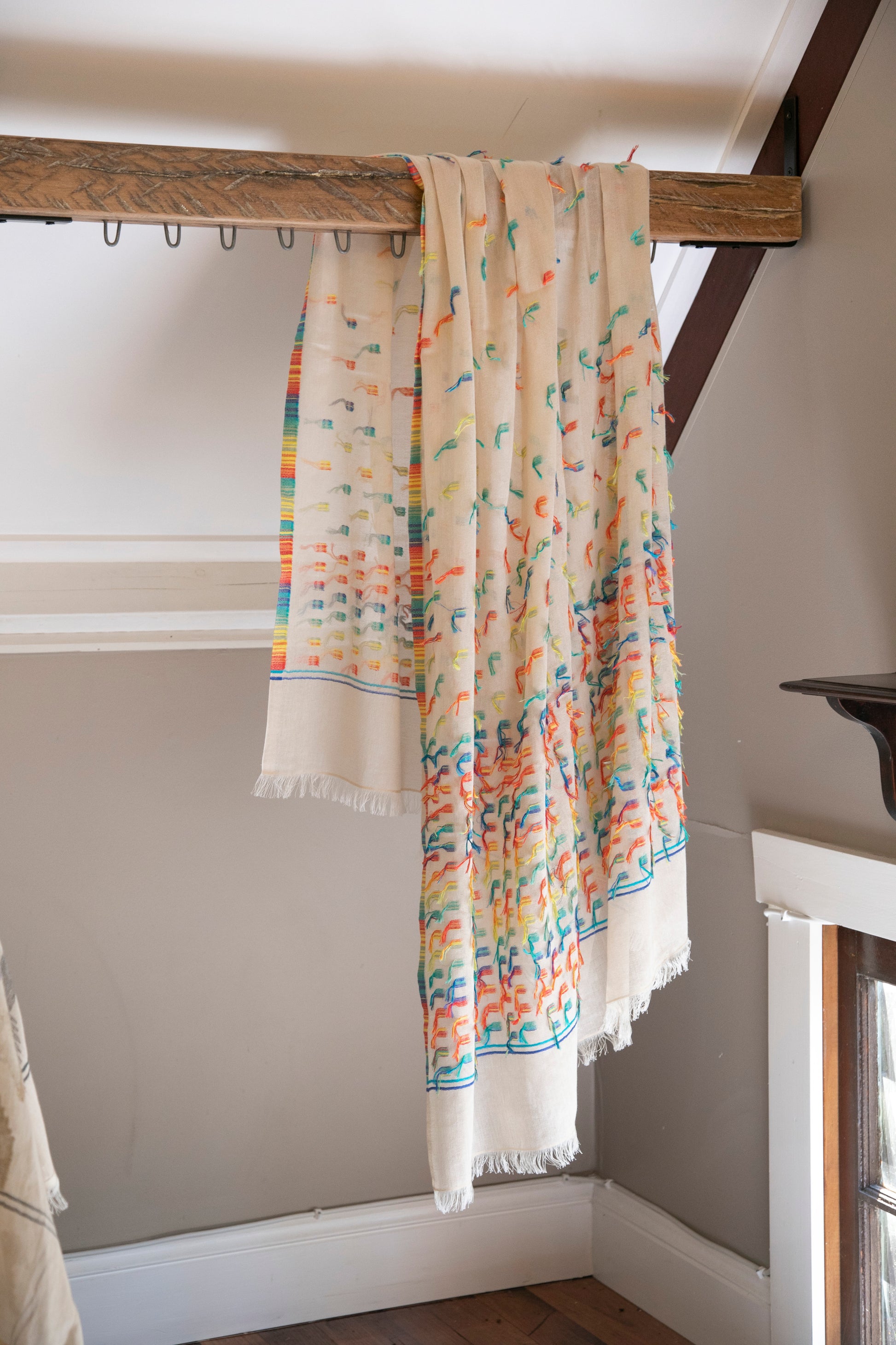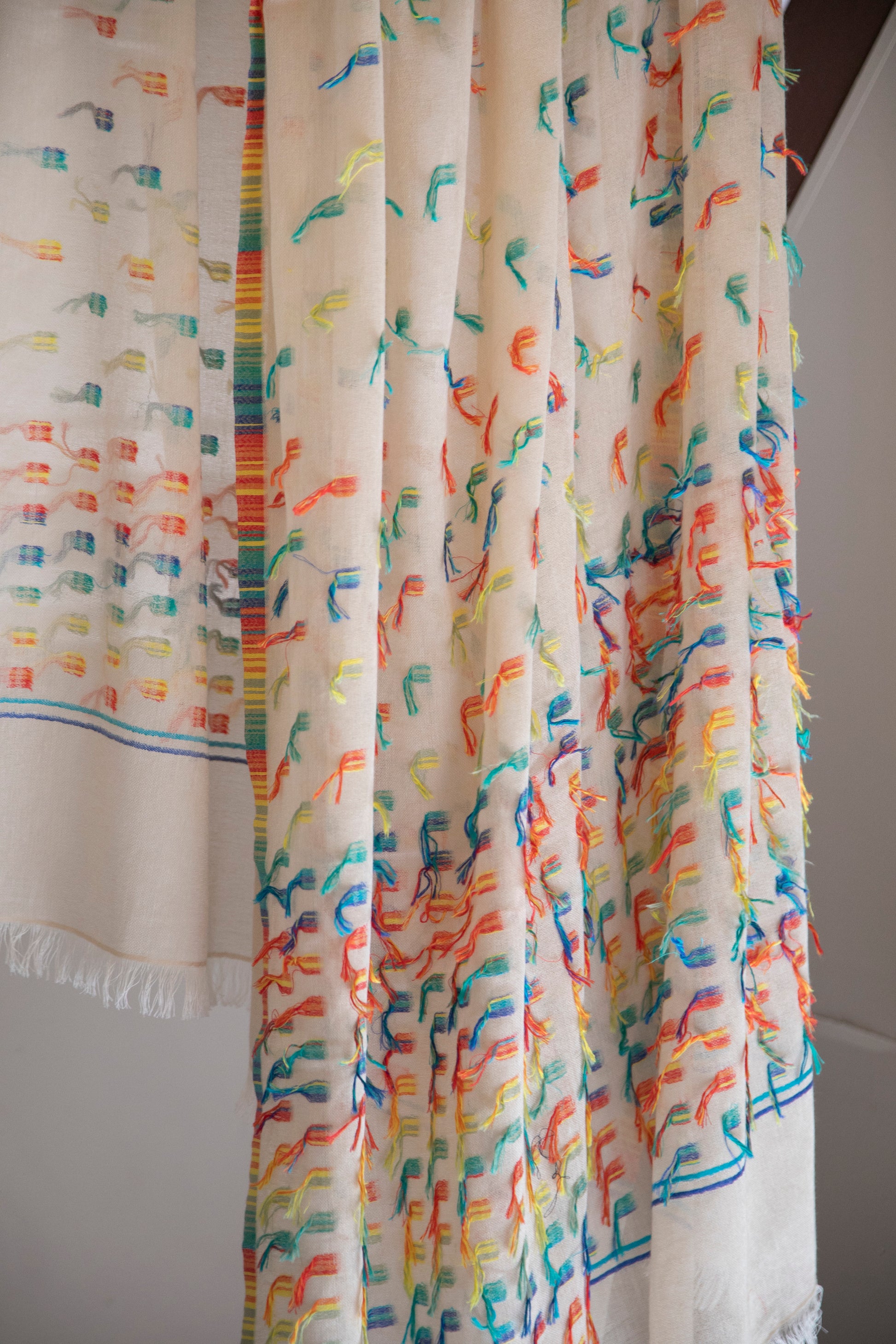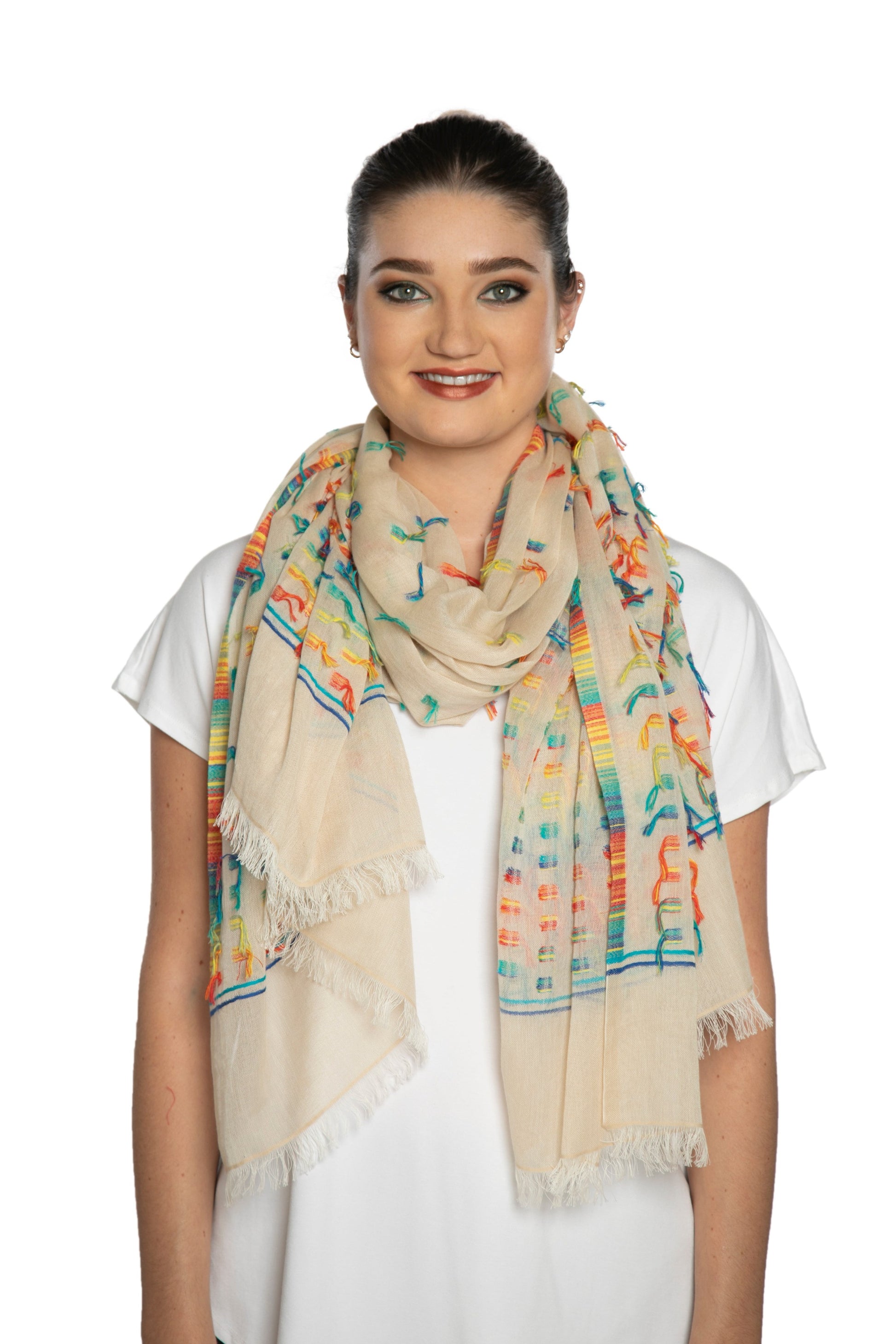 The Astro Scarf has a light cream base with self fabric fine fringe detail. The colours featured in the scarf are bright and warm. The finish consists of small groupings of coloured cotton thread woven into the base cloth by machine with the the ends loose. This gives it an eclectic textured handmade feel to the Scarf.