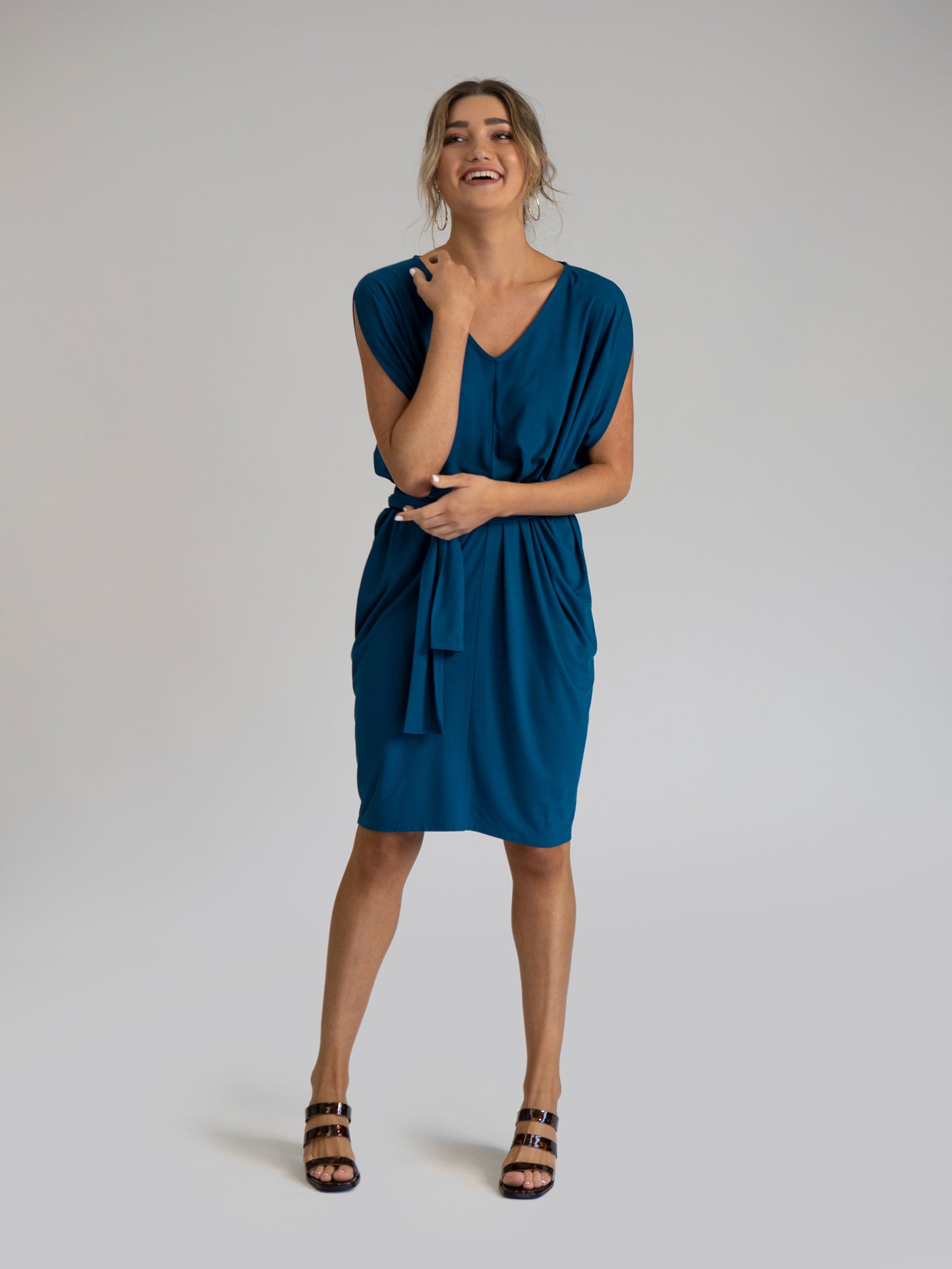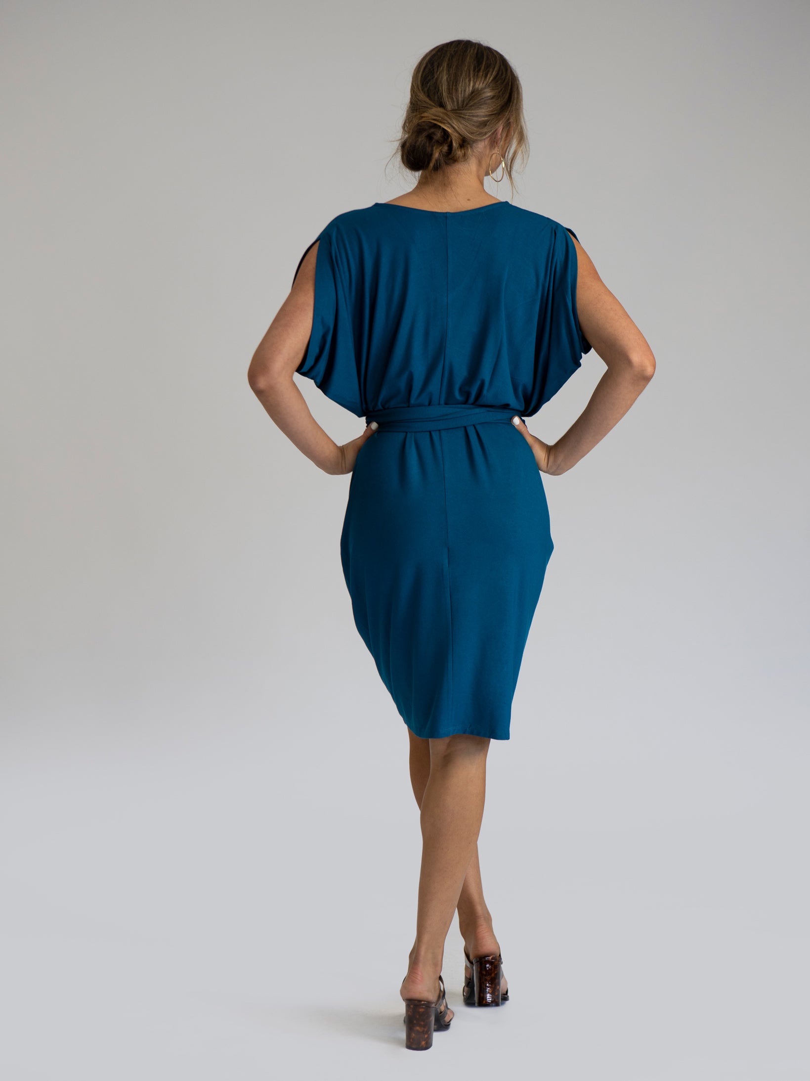 The Crystal Dress is a simple design featuring a v-neck and a wide self-fabric detached belt. The design is based on a slightly tapered silhouette. The dress has a very flattering sleeve that mainly exposes the upper arm's top. The dress can be worn loose, or the tie can be applied to the waist, under the bust area or around the hips and bloused for a long-waisted appearance.