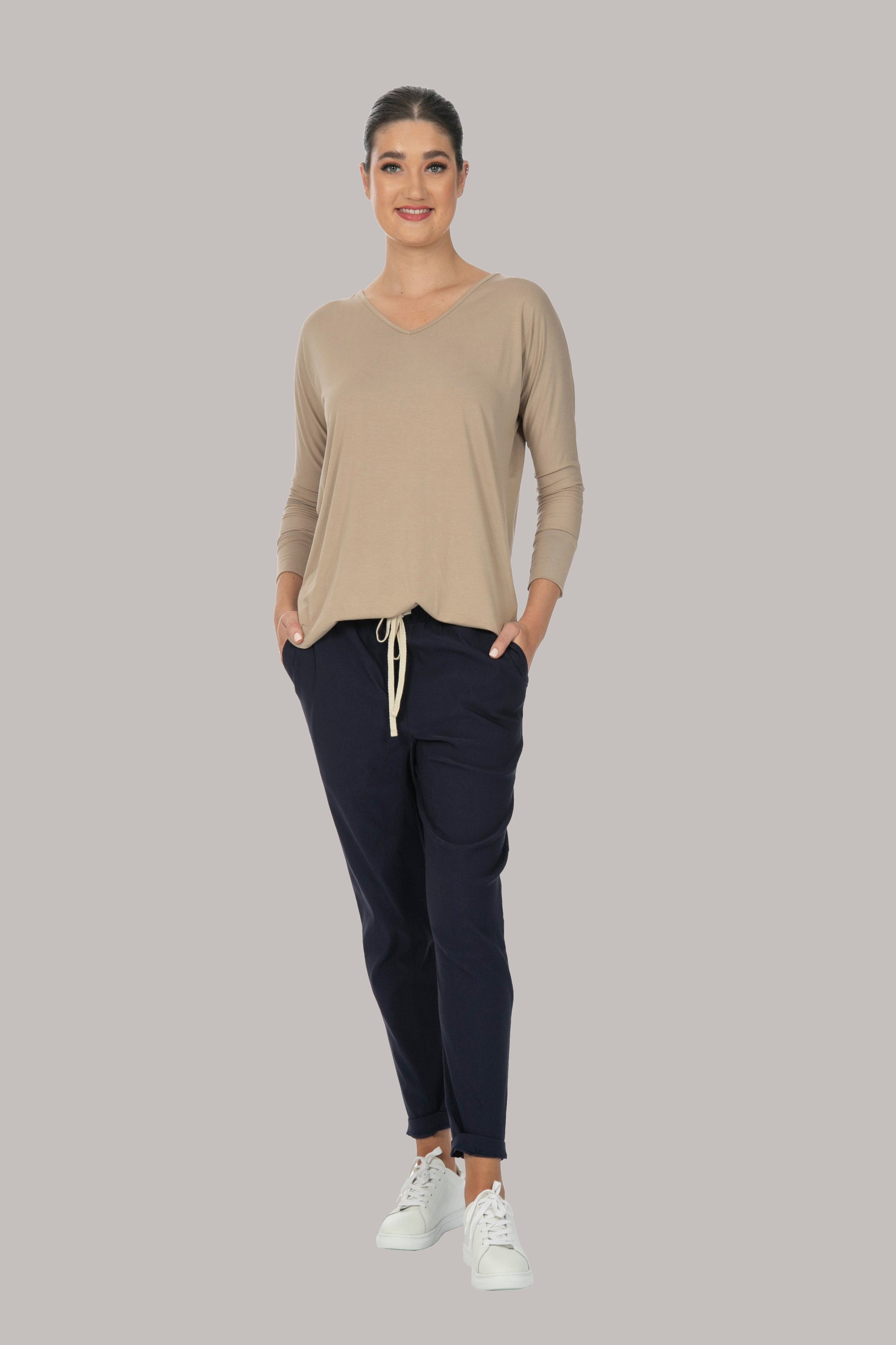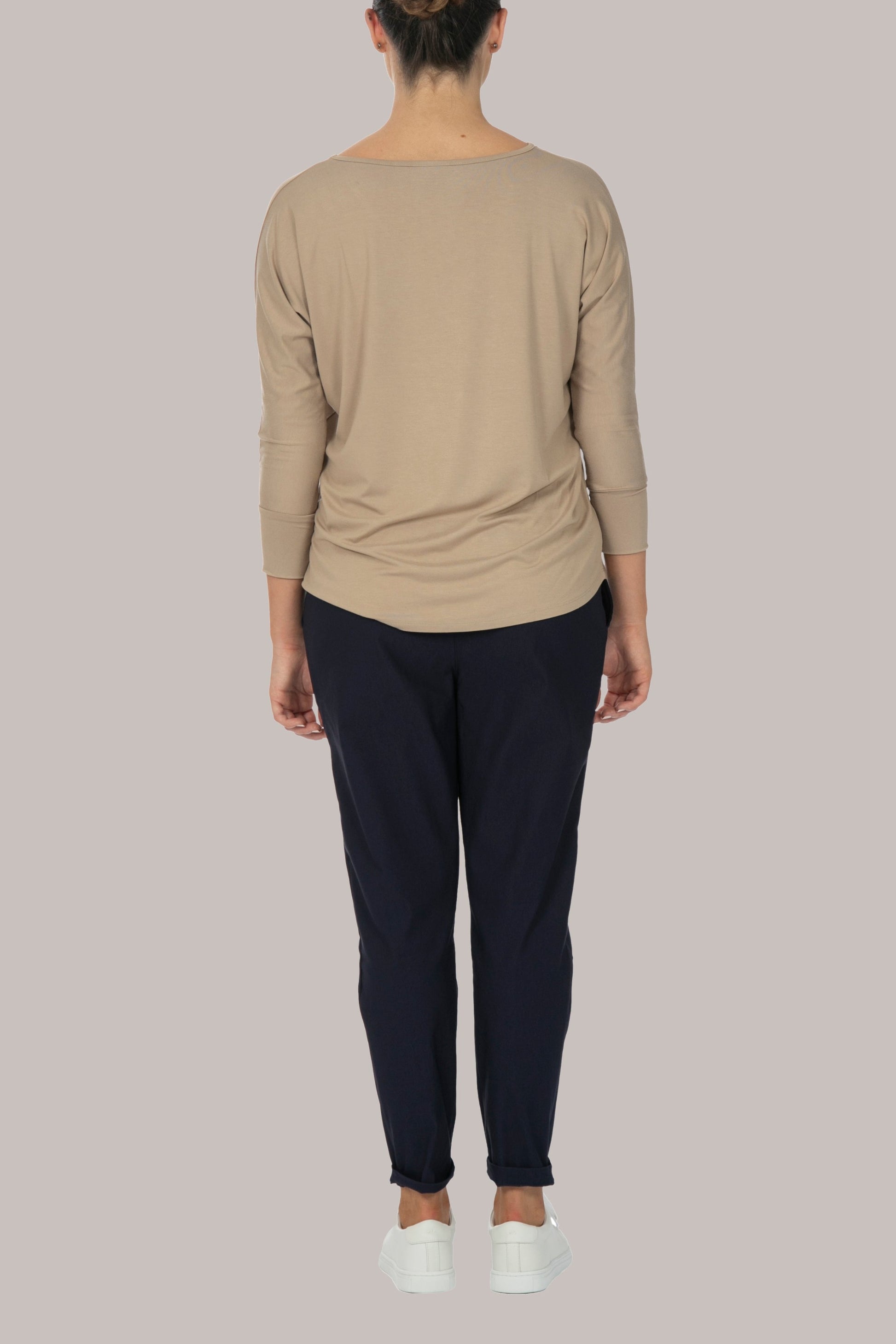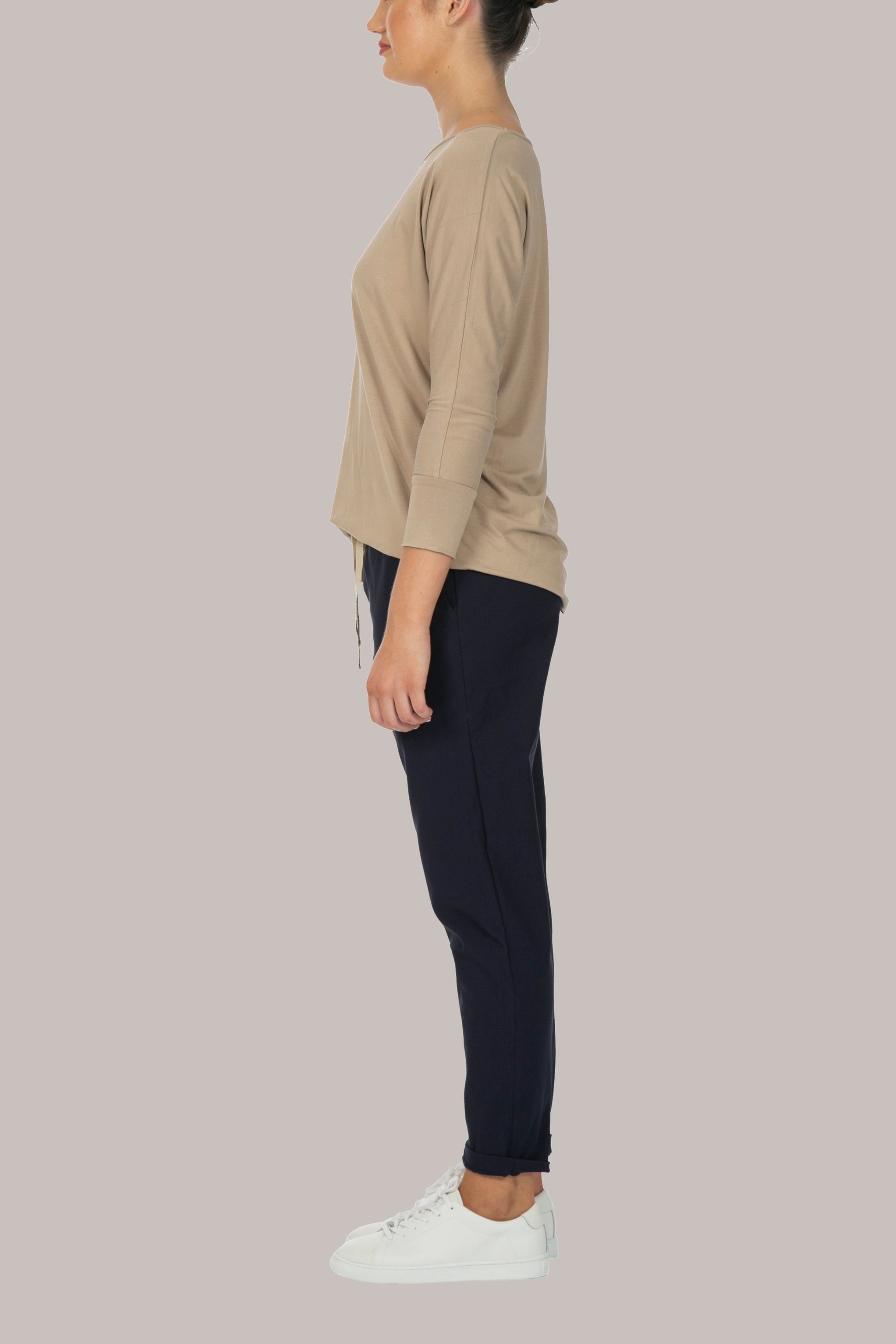 Our Flourish long-sleeve top has a rounded hem finish, and is comfortably loose with a self-fabric cuff, making for a comfortable adjustable sleeve length from long, to 3/4. It has a rounded hemline finish, and the fabric is treated fabric for a quality feel and drape.