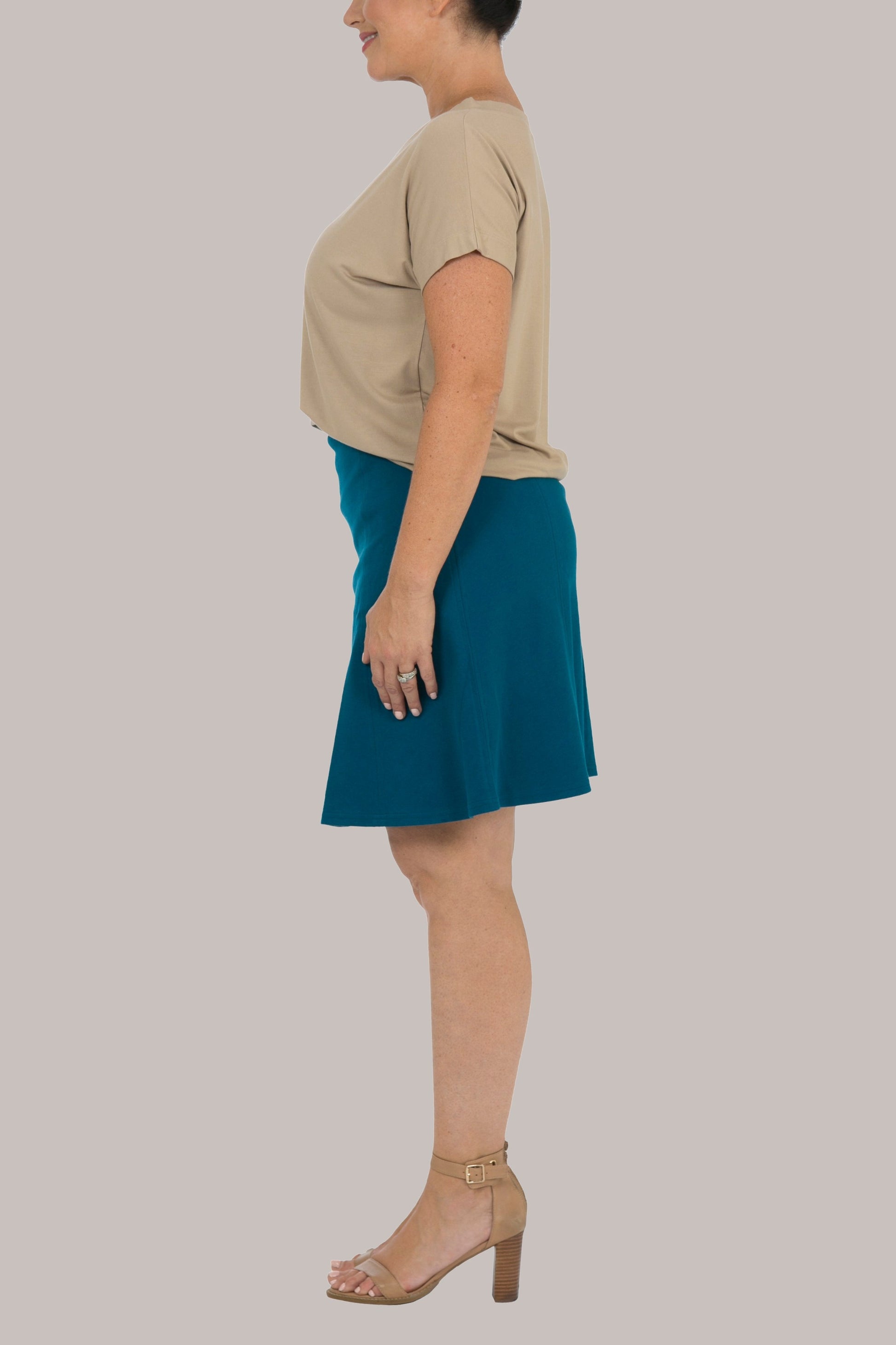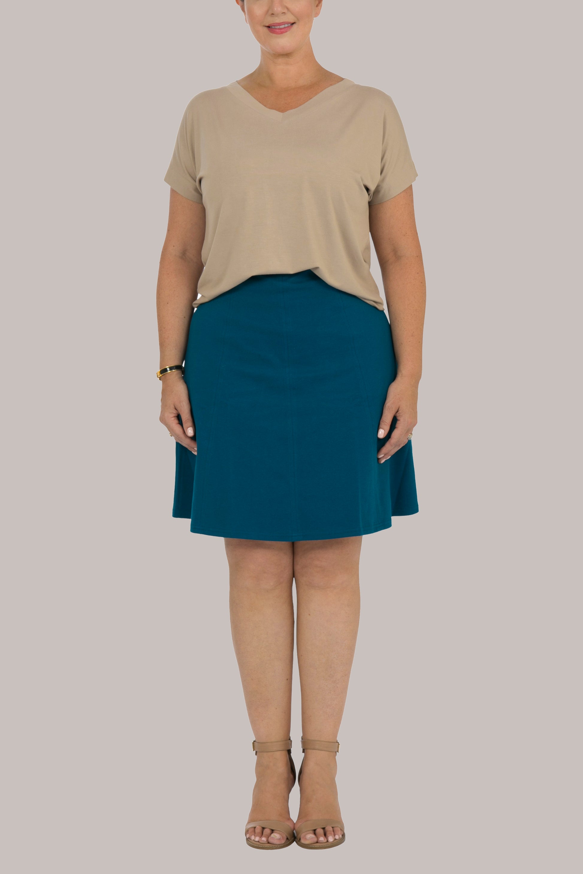 Inspired Tee has a fabulous statement V-neck with an extended shoulder line. A looser-fitting Tee with a rounded hem finish, the Inspired Tee is made for easy, everyday wear in a quality fabric with a soft drape and feel. The neckline features a wider fashion trim and hemline.