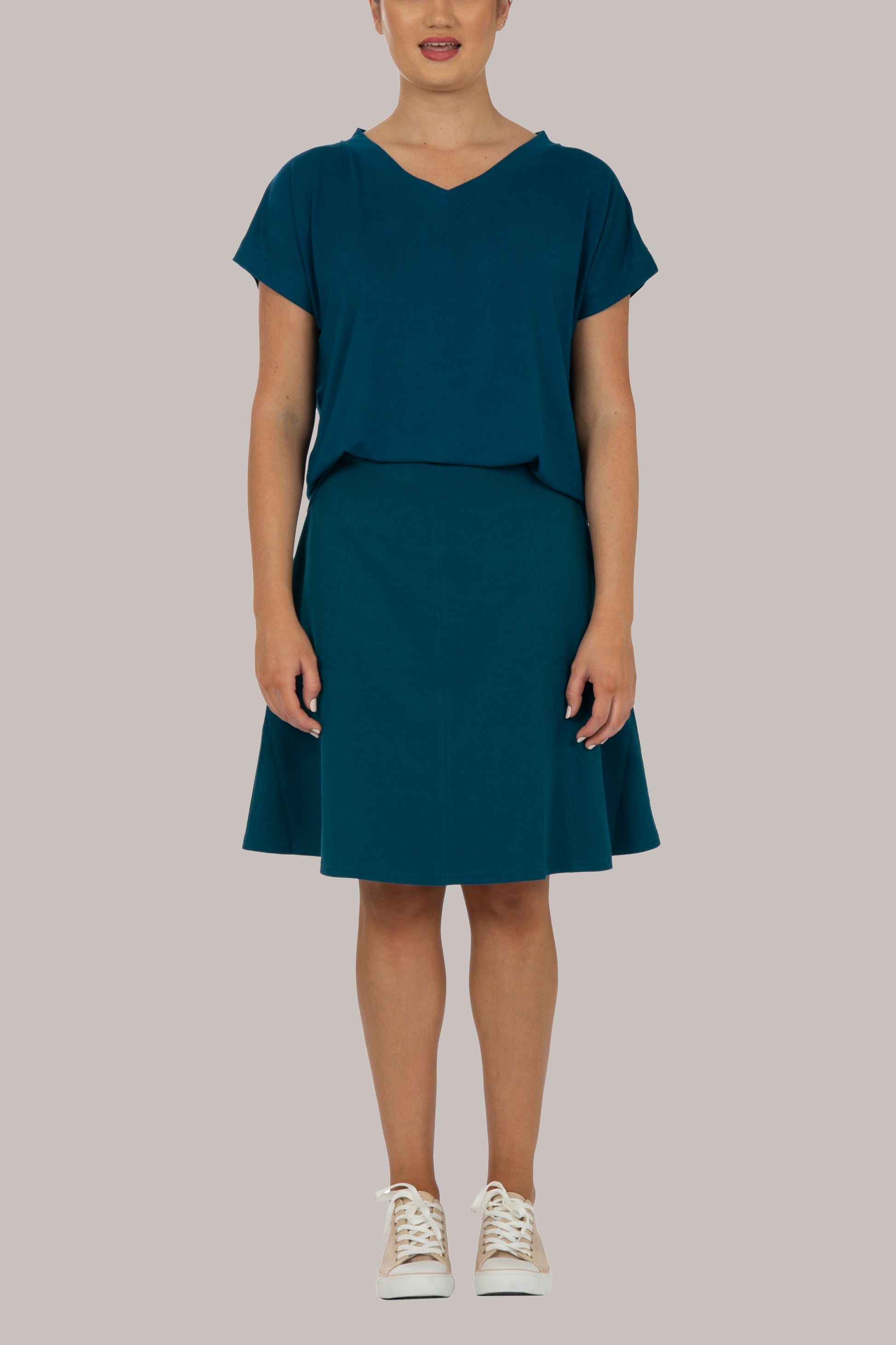 Inspired Tee has a fabulous statement V-neck with an extended shoulder line. A looser-fitting Tee with a rounded hem finish, the Inspired Tee is made for easy, everyday wear in a quality fabric with a soft drape and feel. The neckline features a wider fashion trim and hemline.