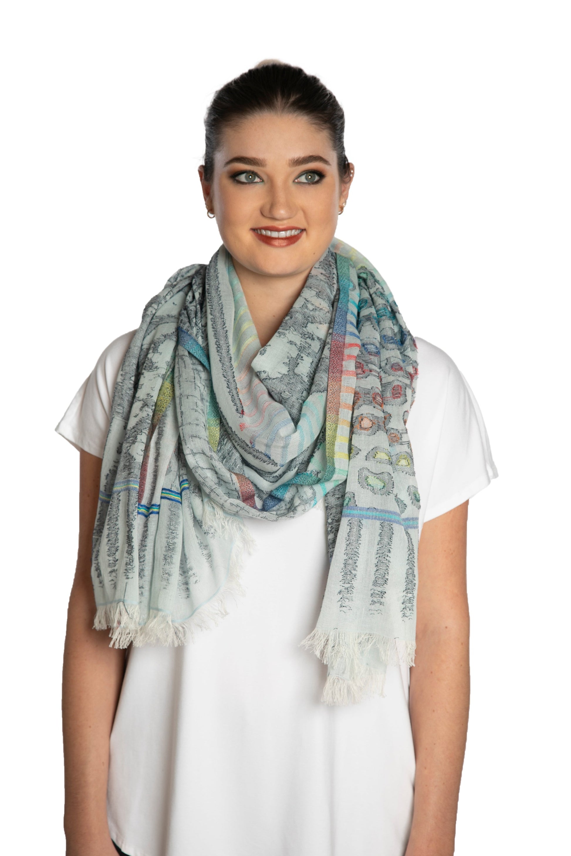 This scarf features delicate grey marled print enhanced with random borders of stripes and irregular shapes in subdued colours. It is a low contrast print with a touch of medium brightness. Slight soft and subtle self fabric fringing at each end of scarf.
