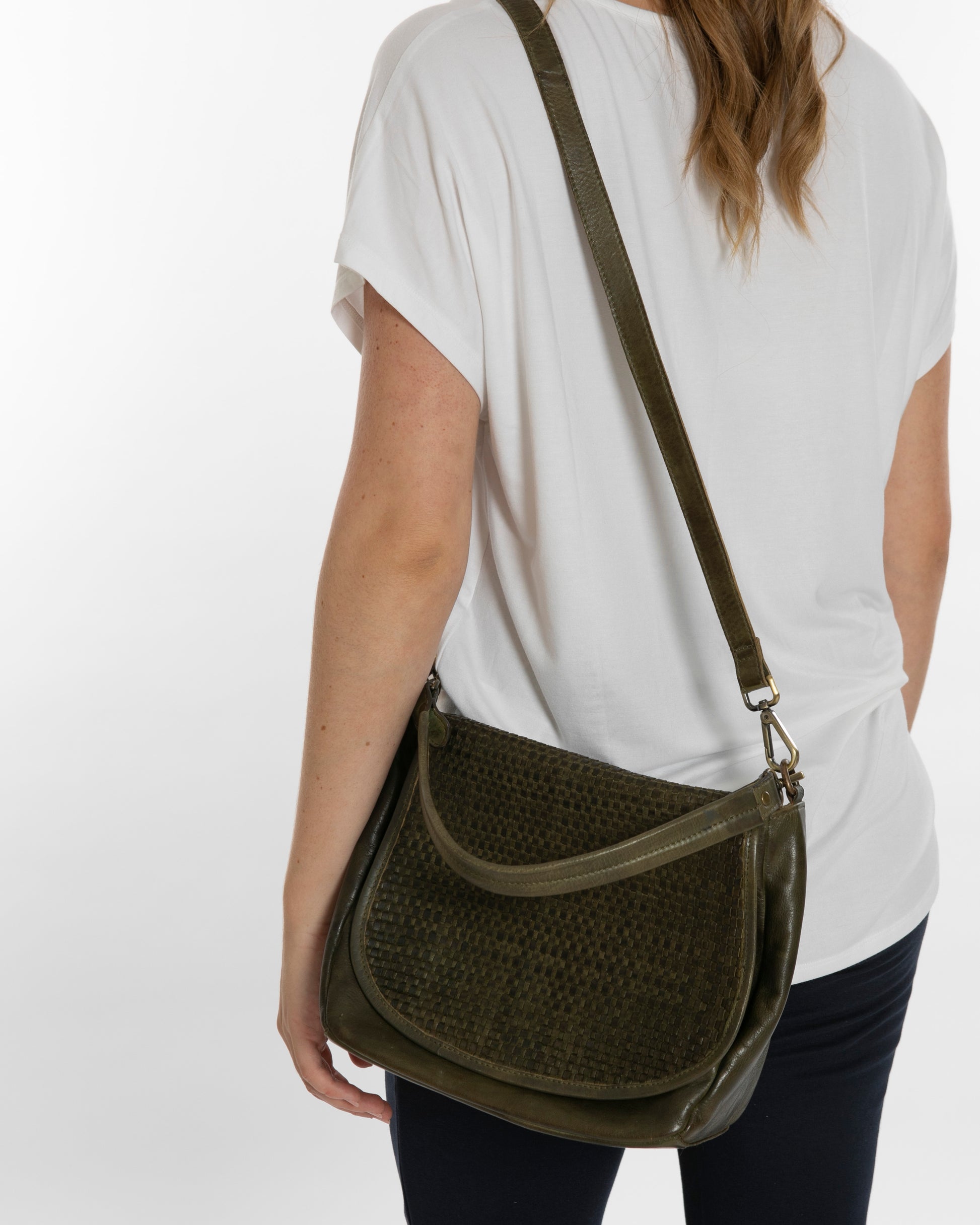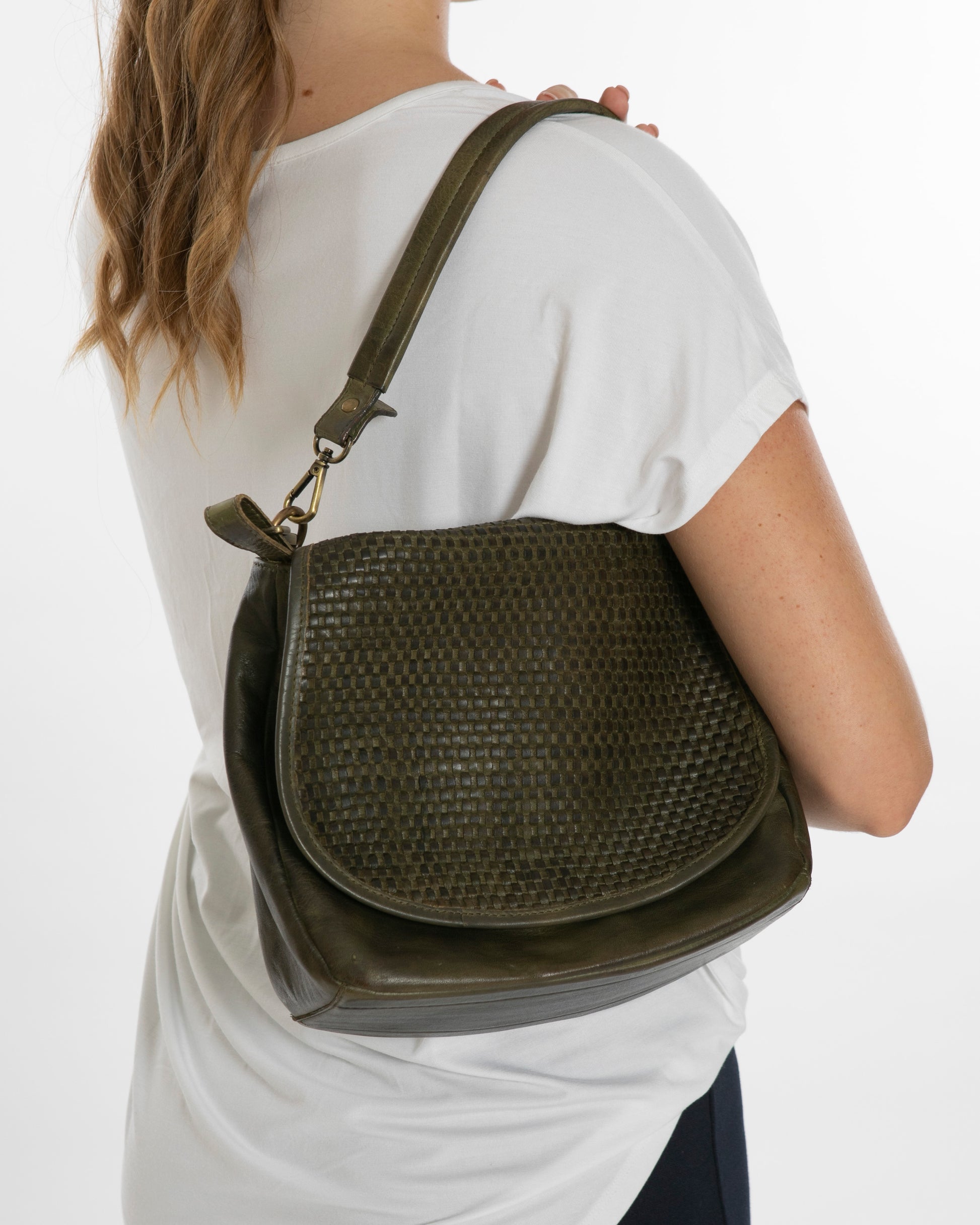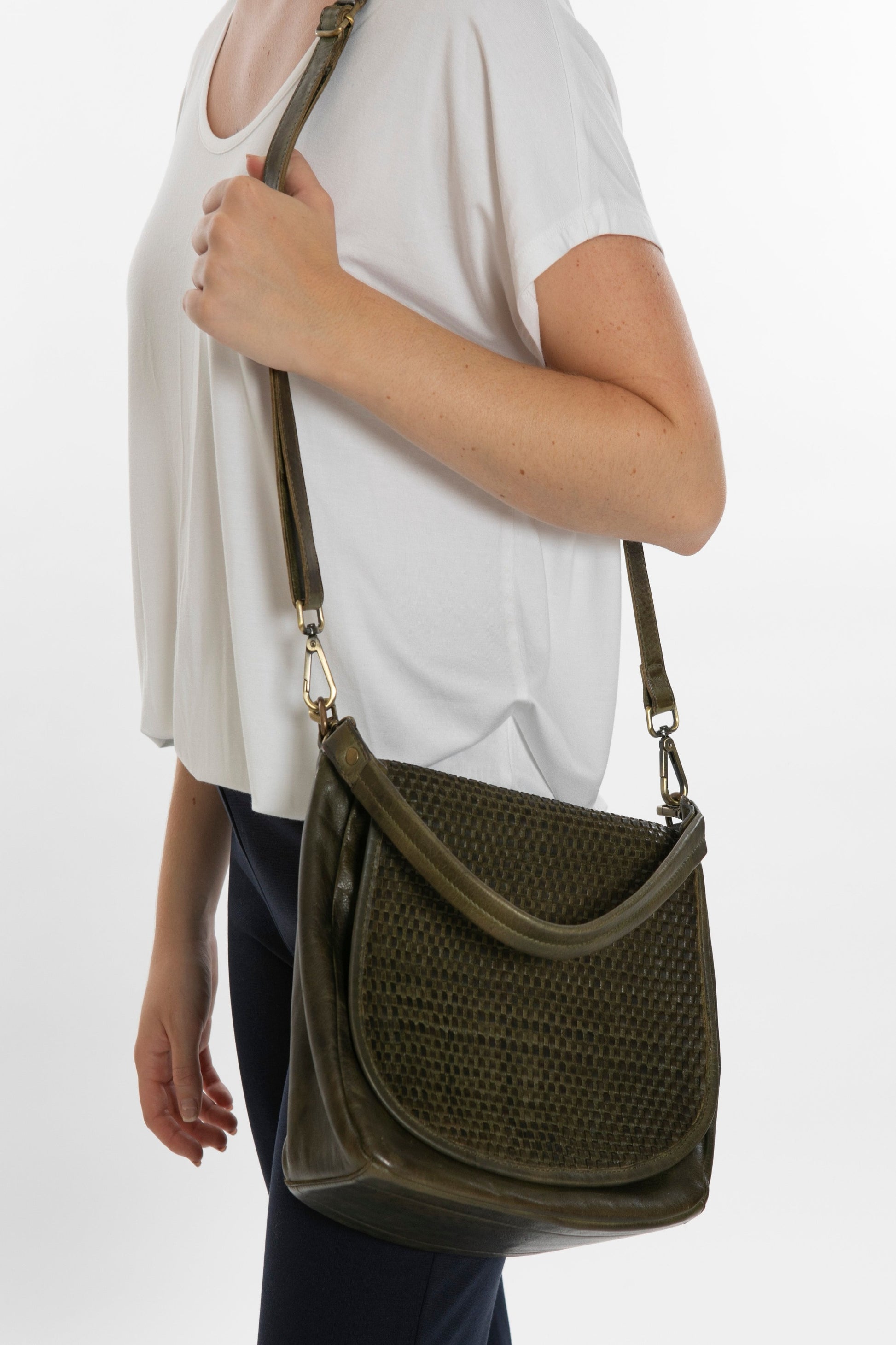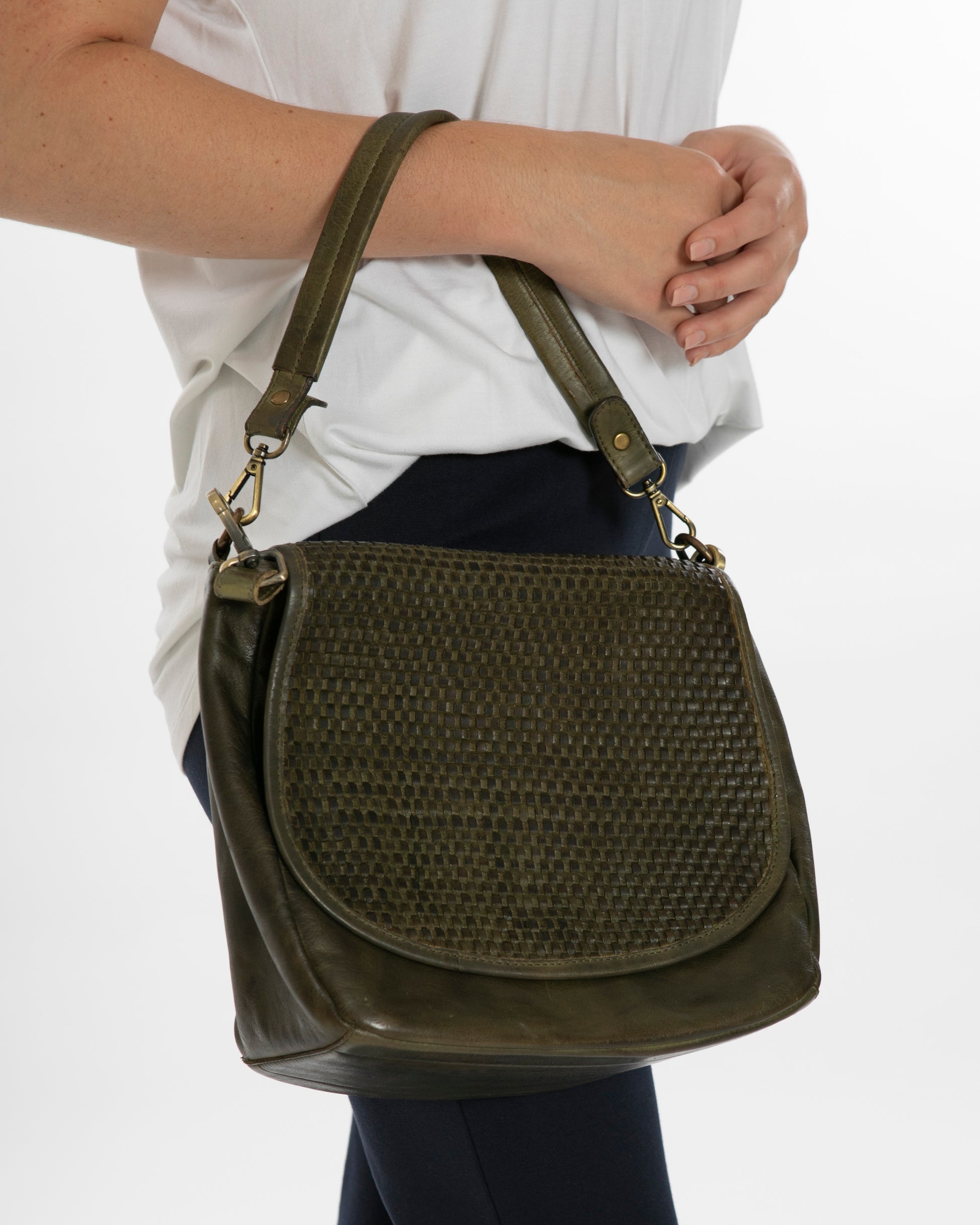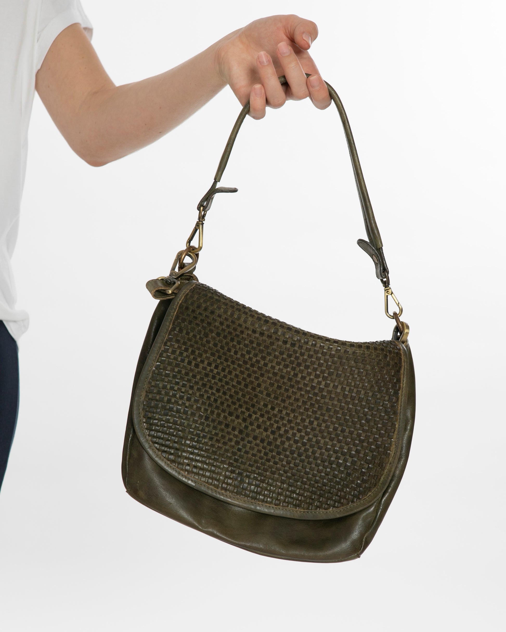 This soft leather bag with detachable adjustable shoulder strap and short strap with brass "antique finish" hardware stands out due to its beautiful hand plaited feature. Finely plaited leather features on the front flap overlay which is kept in place with a brass press stud. The inside of the bag itself is secured with metal zip .