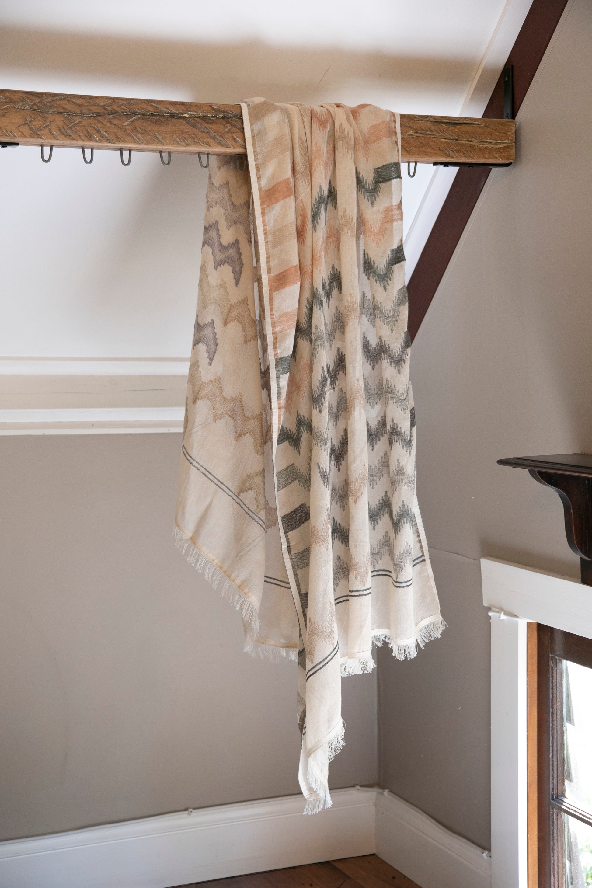This scarf is a low contrast print with a series of regular graphic lines in mid green, dark sand and rust on a very soft peach background. Beautifully top stitched and taped to secure the hemline this scarf also features a very soft short fringe at each end.