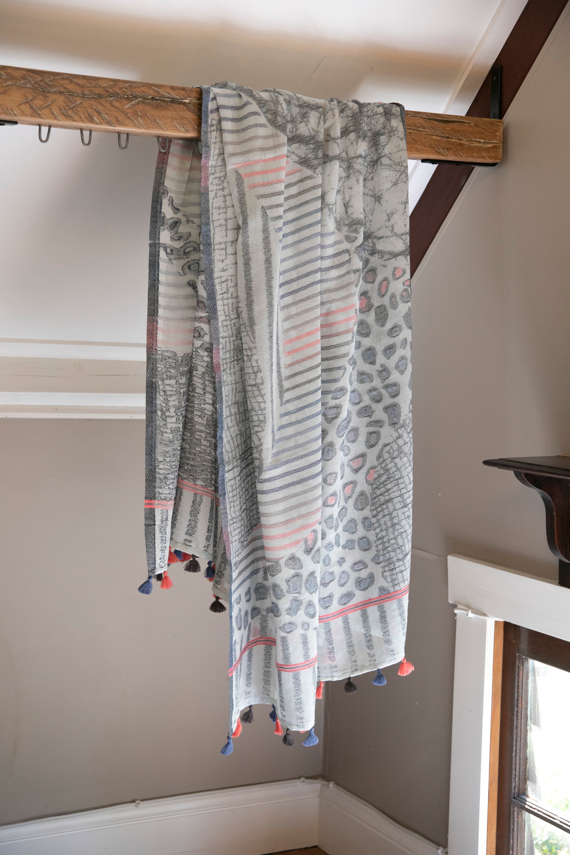 A soft print featuring soft contrast this scarf adds a touch of colour to your neutrals without providing too much contrast or brightness. A touch of subtle detail to your outfit . This scarf features delicate grey marled print enhanced with random borders of stripes and irregular shapes in subdued colours. It is a low contrast print with a touch of medium brightness. The ends of each scarf feature a soft coral, charcoal and periwinkle blue tassels, each individually hand stitched to scarf hemline.