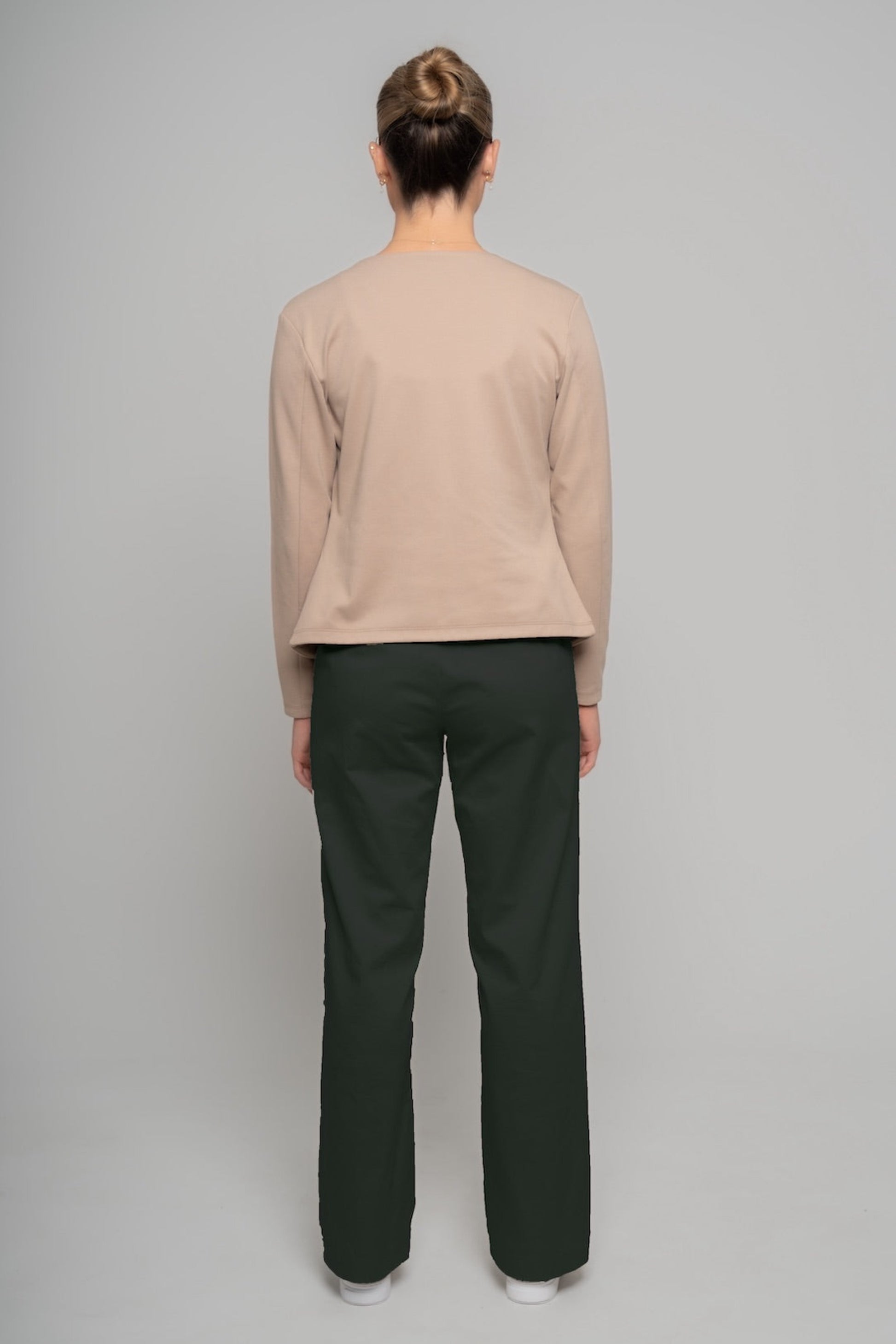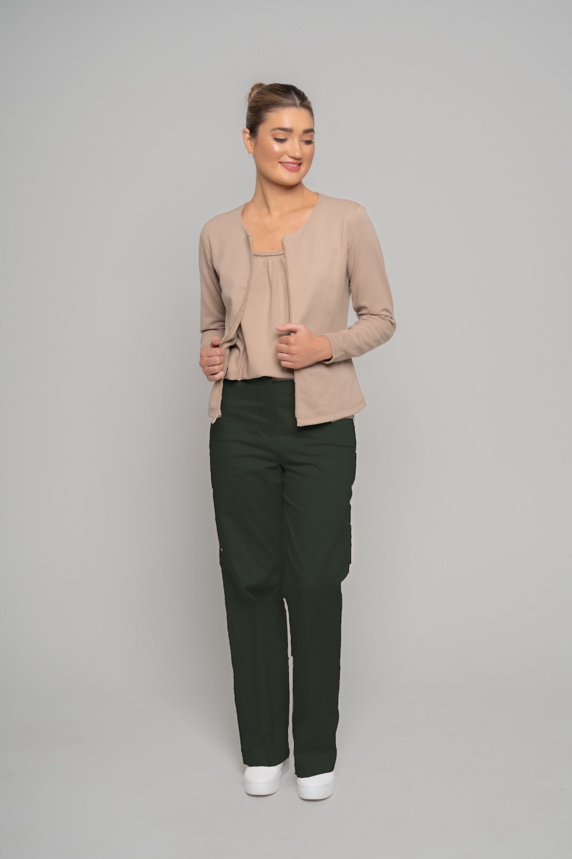 Our Wide Leg Pants are a mid-weight style suitable for all seasons. The features of these pants are the flattering horizontal seam running down the centre of each leg and the lack of pleats at the waistline. The waistband has belt loops and an elastic insert at the back for easy fit around the waist. The pant also has a pocket inserted into the side seams—no rear pockets.