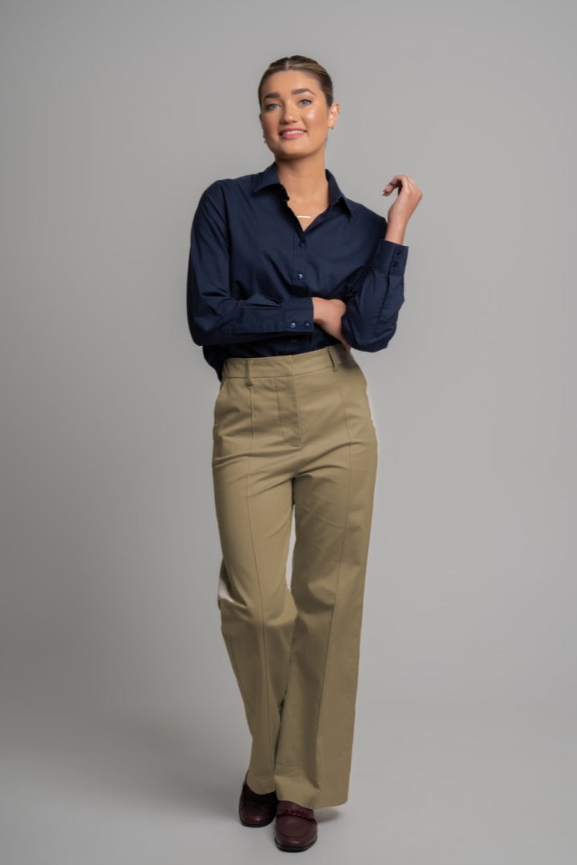 Our Wide Leg Pants are mid-weight pants suitable for all seasons. The features of these pants are the flattering horizontal line seam running down the front of each leg and the absence of pleating at the waistline. The waistband has belt loops and an elasticised insert at the rear for easy fit around the waist. The pant has a pocket inserted into the side seams and has no rear pockets. The pants are slightly lighter in shade than shown here.
